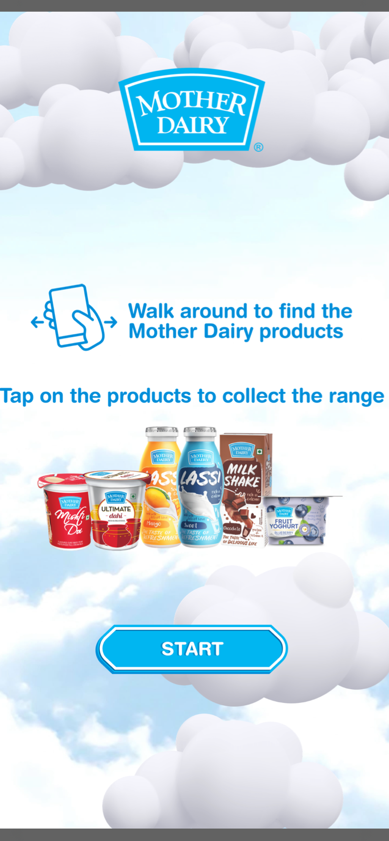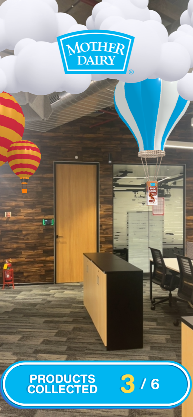 - Building Awareness- The first AR experience was an interactive idea wherein the users were urged to collect the hot air balloons with Mother Dairy products and avoid the other objects while moving around in their real-time environment. To make the users aware about the Fresh Delights range, once the user clicked the Mother Dairy products balloon during the gameplay, a brief description of the product was given to the user. Once all six products were collected by the user, we had two call to action options- users could share the experience with friends and family or could go to the Big Basket page where the range of products were available for purchase.