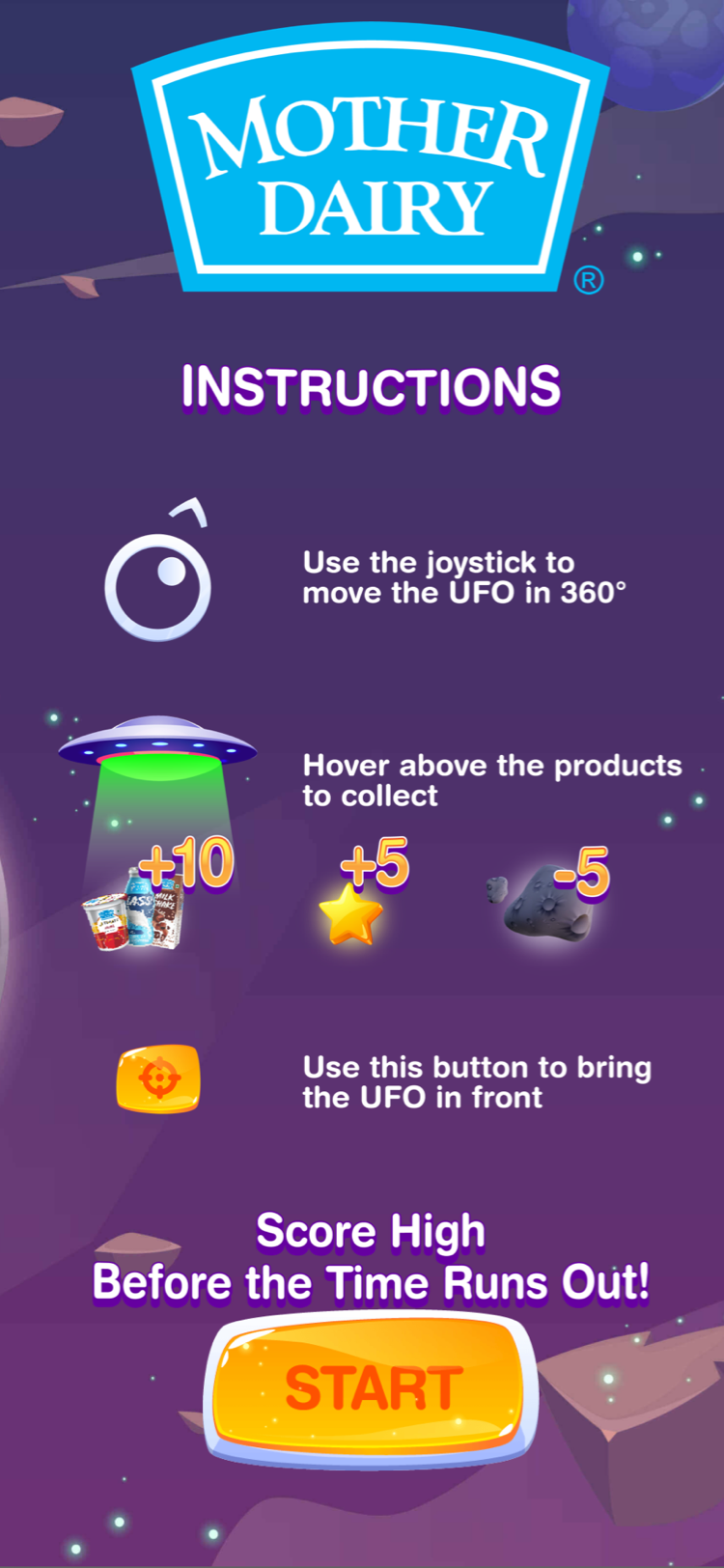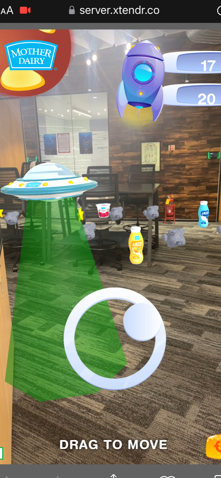- Building Engagement- The second AR experience created was gamification wherein the users were asked to collect the Mother Dairy products from the UFO which was controlled by a joystick. With sixty seconds on the clock, we urged users to score high by collecting the Mother Dairy products and avoiding the asteroids (there was negative marking on catching the asteriods). The users could submit the scores to the leaderboard along with their contact information. The winners were gratified for their position on the leaderboard.