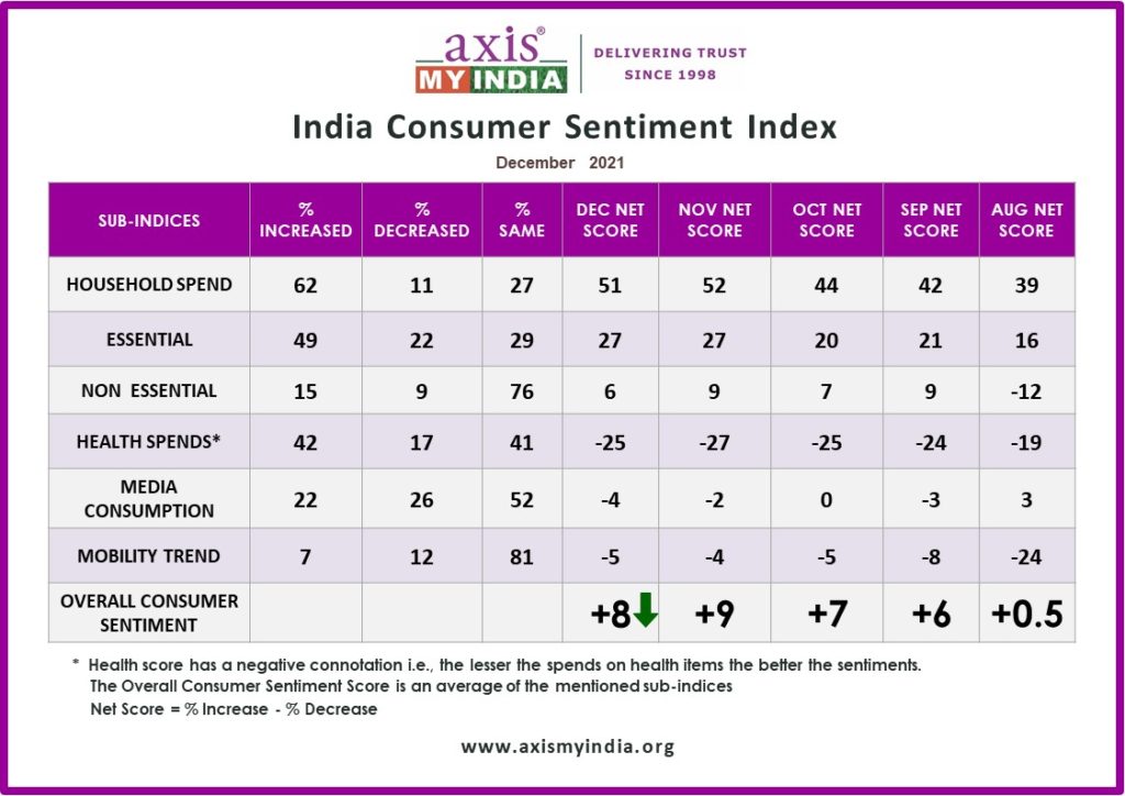 The December net CSI score, calculated by percentage increase minus percentage decrease in sentiment, was down to +8, from +9 last month and a first-time slight dip in the net score is observed since past 4 months, a reflection of the post-festive period sentiment.