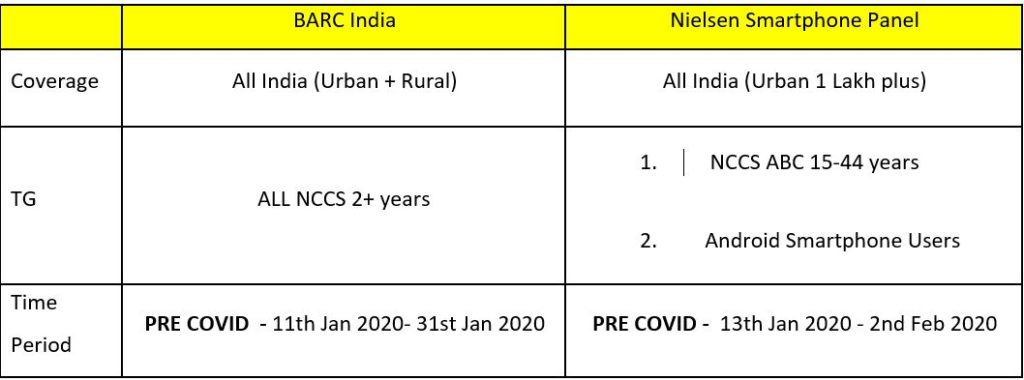 BARC India is the official currency on Television Measurement in India and Nielsen Media runs a 12,000 strong smartphone panel in India passively capturing smartphone behaviour.